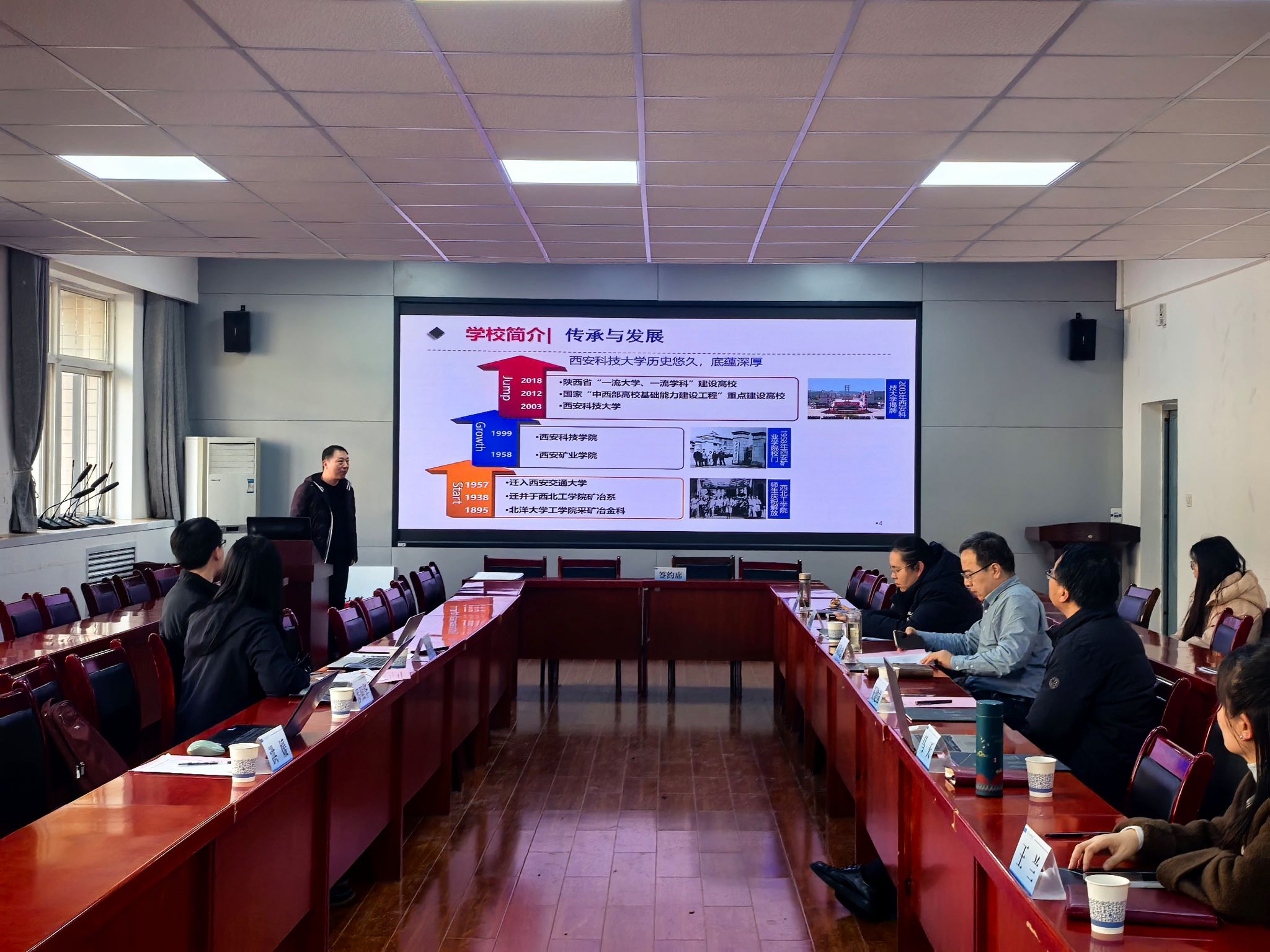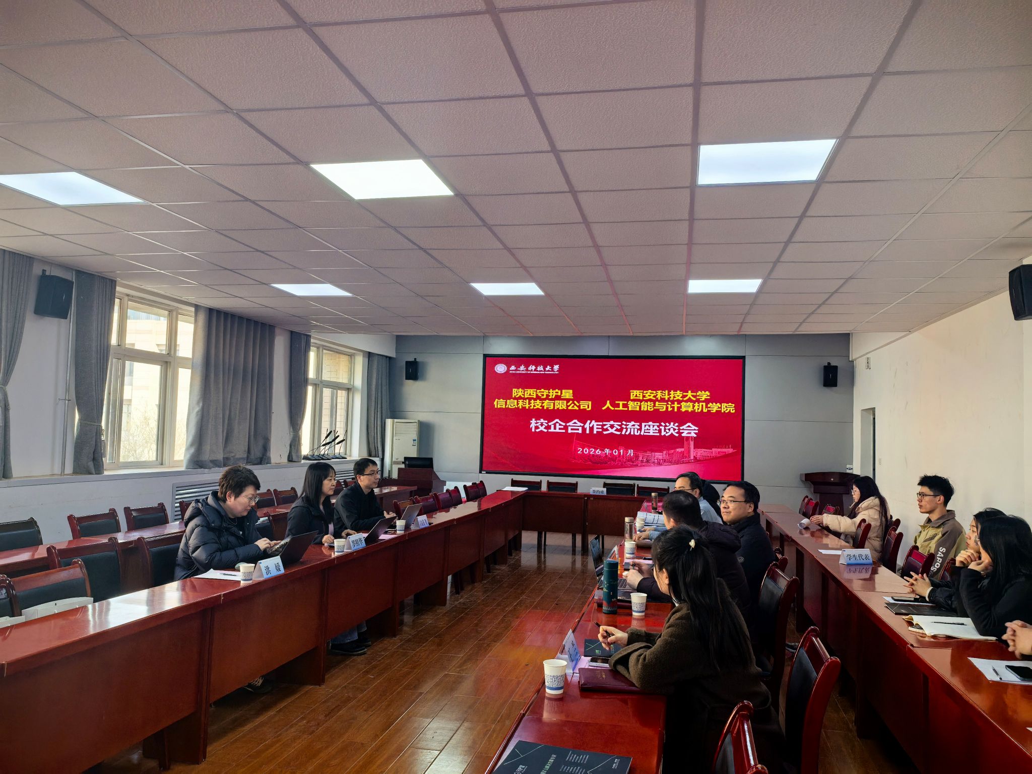 11月16日下午,人工智能学院与陕西守护星信息科技有限公司在骊山校园学院会议室举行校企合作交流座谈会。陕西守护星信息科技有限公司总经理罗照华、技术经理闫占飞、招聘经理洪媛,人工智能学院党委书记王建强、副院长马天及教师代表、毕业班辅导员、2026届学生代表参加了会议。党委副书记郭胜忠主持会议。